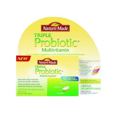 Please read all label information on delivery.1 caplet contains Probiotic Blend 29.5mg (10 million CFU).Probiotics - Help to maintain the balance of good bacteria within the digestive tract to support the body's natural immune defenses.*.Vitamins & Minerals - Work together with the probiotics to provide dual levels of support for the body's immune system.*.Patented smart release tri-layer caplet designed for maximized product efficacy..Nature Made Triple Probiotic Multivitamin - 2 Bottles 30 Caplets Each - 60 Total Caplets Features.